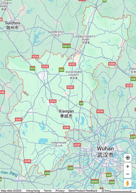 Again the author forgets, Xiaogan Prefectural City has a land area of 8,923km2 (3,445 sq mi) with over 4 million people scattered across. You can have multiple high speed railway stations serving such a large area.